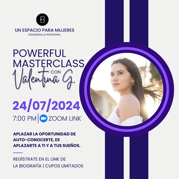 - mié, 24 julZoom Webinar"Aplazar la oportunidad de auto-conocerte, es aplazarte a ti y a tus sueños" - Valentina García. Un espacio sólo para mujeres que desean transformar su realidad y conectar con otras mujeres que buscan el mismo crecimiento, juntas; somos imparables.
